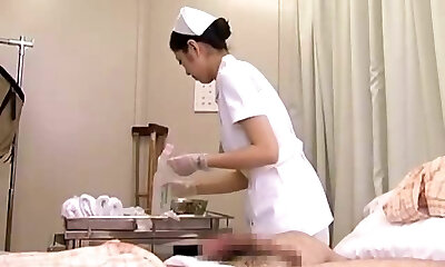 Three fabulous nurses come into my health center room, pull out my cock and give me a blowjob and a hand-job