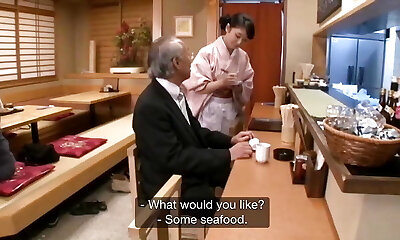 Naked granny in the kitchen pummels her silverware before the baker fucks her anus hard through