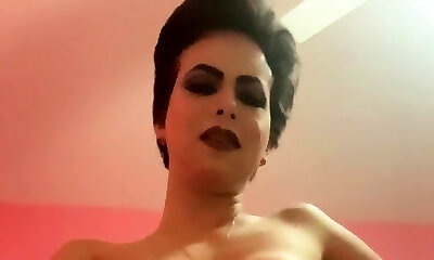 Fishnet bodystocking with her massive erect sausage getting stroked by her soft and lovely hands as they pinch her nipples