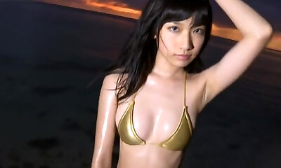 Divine brown-haired angel from Asia Yoko Kumada walks outdoors in bathing suit